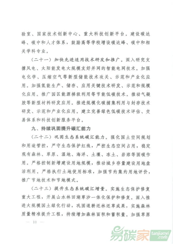 (二十)強化基礎研究和前沿技術(shù)布局。制定科技支撐碳達峰、碳中和行動方案,編制碳中和技術(shù)發(fā)展路線圖。采用“揭榜掛帥”機制,開展低碳零碳負碳和儲能新材料、新技術(shù)、新裝備攻關。加強氣候變化成因及影響、生態(tài)系統(tǒng)碳匯等基礎理論和方法研究。推進高效率太陽能電池、可再生能源制氫、可控核聚變、零碳工業(yè)流程再造等低碳前沿技術(shù)攻關。培育一批節(jié)能降碳和新能源技術(shù)產(chǎn)品研發(fā)國家重點實驗室、國家技術(shù)創(chuàng)新中心、重大科技創(chuàng)新平臺。建設碳達峰、碳中和人才體系,鼓勵高等學校增設碳達峰、碳中和相關學科專業(yè)。