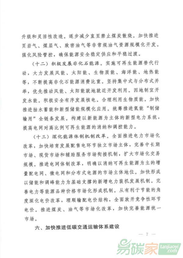 (三十三)推進市場化機制建設。依托公共資源交易平臺,加快建設完善全國碳排放權(quán)交易市場,逐步擴大市場覆蓋范圍,豐富交易品種和交易方式,完善配額分配管理。將碳匯交易納入全國碳排放權(quán)交易市場,建立健全能夠體現(xiàn)碳匯價值的生態(tài)保護補償機制。健全企業(yè)、金融機構(gòu)等碳排放報告和信息披露制度。完善用能權(quán)有償使用和交易制度,加快建設全國用能權(quán)交易市場。加強電力交易、用能權(quán)交易和碳排放權(quán)交易的統(tǒng)籌銜接。發(fā)展市場化節(jié)能方式,推行合同能源管理,推廣節(jié)能綜合服務。