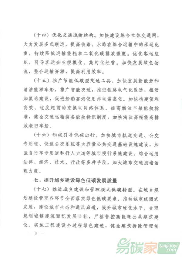 (十七)推進城鄉(xiāng)建設和管理模式低碳轉(zhuǎn)型。在城鄉(xiāng)規(guī)劃建設管理各環(huán)節(jié)全面落實綠色低碳要求。推動城市組團式發(fā)展,建設城市生態(tài)和通風廊道,提升城市綠化水平。合理規(guī)劃城鎮(zhèn)建筑面積發(fā)展目標,嚴格管控高能耗公共建筑建設。實施工程建設全過程綠色建造,健全建筑拆除管理制度,杜絕大拆大建。加快推進綠色社區(qū)建設。結(jié)合實施鄉(xiāng)村建設行動,推進縣城和農(nóng)村綠色低碳發(fā)展。