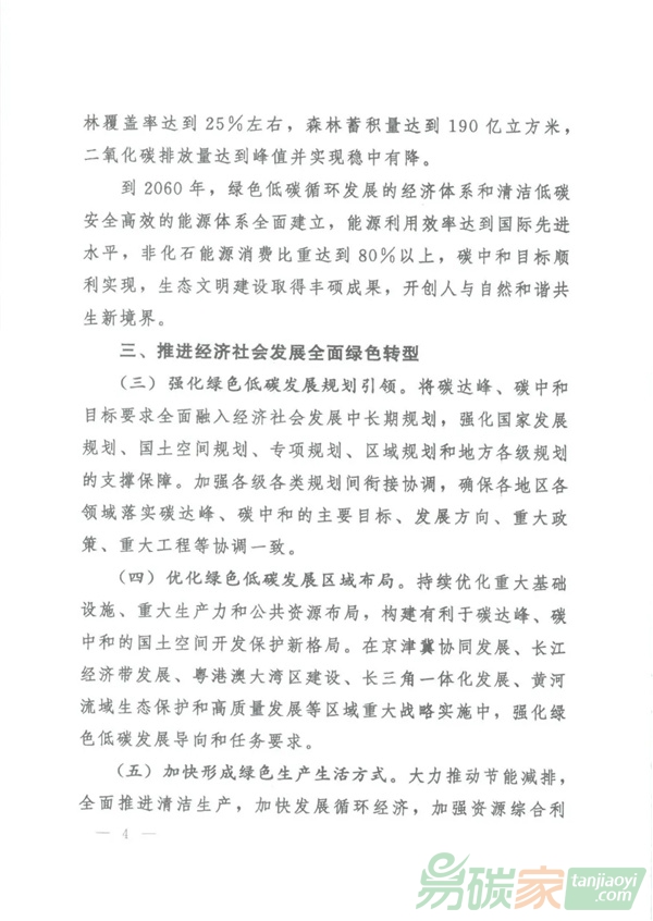 (三)強化綠色低碳發(fā)展規(guī)劃引領。將碳達峰、碳中和目標要求全面融入經(jīng)濟社會發(fā)展中長期規(guī)劃,強化國家發(fā)展規(guī)劃、國土空間規(guī)劃、專項規(guī)劃、區(qū)域規(guī)劃和地方各級規(guī)劃的支撐保障。加強各級各類規(guī)劃間銜接協(xié)調(diào),確保各地區(qū)各領域落實碳達峰、碳中和的主要目標、發(fā)展方向、重大政策、重大工程等協(xié)調(diào)一致。