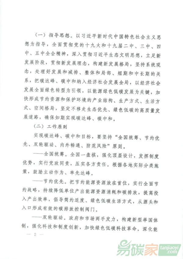 (一)指導思想。以習近平新時代中國特色社會主義思想為指導,全面貫徹黨的十九大和十九屆二中、三中、四中、五中全會精神,深入貫徹習近平生態(tài)文明思想,立足新發(fā)展階段,貫徹新發(fā)展理念,構(gòu)建新發(fā)展格局,堅持系統(tǒng)觀念,處理好發(fā)展和減排、整體和局部、短期和中長期的關系,把碳達峰、碳中和納入經(jīng)濟社會發(fā)展全局,以經(jīng)濟社會發(fā)展全面綠色轉(zhuǎn)型為引領,以能源綠色低碳發(fā)展為關鍵,加快形成節(jié)約資源和保護環(huán)境的產(chǎn)業(yè)結(jié)構(gòu)、生產(chǎn)方式、生活方式、空間格局,堅定不移走生態(tài)優(yōu)先、綠色低碳的高質(zhì)量發(fā)展道路,確保如期實現(xiàn)碳達峰、碳中和。