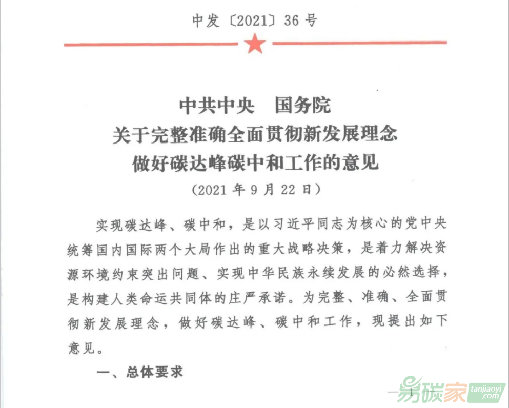 中共中央 國務院關于完整準確全面貫徹新發(fā)展理念做好碳達峰碳中和工作的意見