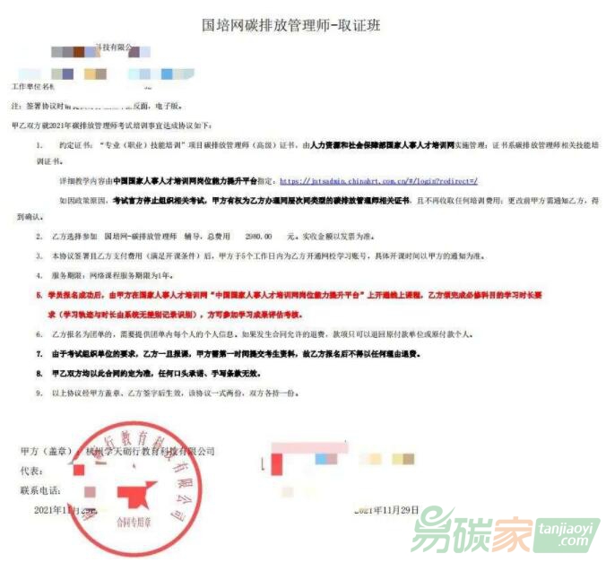“業(yè)務員說碳排放管理證書經(jīng)中國人事網(wǎng)認證。付款后出示的合同上寫的是‘國培網(wǎng)’輔導?!彼杏X不對勁,第二天便聯(lián)系業(yè)務員要求退款。