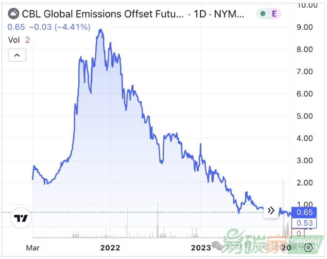 下面兩張圖分別是CORSIA和VCU的價(jià)格走勢,可以看到它們的趨勢其實(shí)是高度相似的,這也從另一個(gè)方面印證了VCS在CORSIA中的分量。