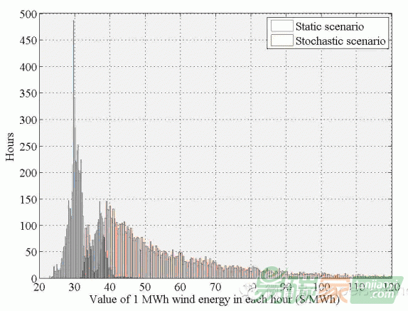 碳交易地板價和2011年二氧化硫和氮氧化物交易價格,推算了不同制度安排下單位風電的價值。結果如下圖所示,與要求風電穩(wěn)定供電(Stochastic情景)相比,豁免風電的穩(wěn)定供電責任(Static情景)大幅降低了風電的價值,而政府在兩種制度下扶持風電的支出是一樣的,消費者在豁免風電穩(wěn)定供電責任下的支付還要更高。