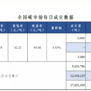今日全國碳市場碳排放配額(CEA)掛牌協(xié)議交易成交量31,768噸,成交額1,329,268.00元,開盤價41.00元/噸,最高價43.50元/噸,最低價41.00元/噸,收盤價41.84元/噸,收盤價較前一日下跌0.90%。今日大宗協(xié)議交易成交量 ... ...