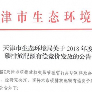 天津市生態(tài)環(huán)境局發(fā)布了關(guān)于2018年度碳排放配額有償競價發(fā)放的公告