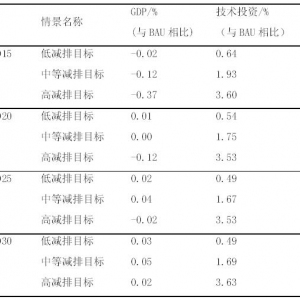 碳市場雖然有利于技術進步和碳減排的實現(xiàn),但是不同的減排目標會對經濟增長產生不同的影響。如表5所示,三種減排目標下,減排初期GDP 相對于基準情景都出現(xiàn)不同程度的下降,分別為0.02%,0.12% 和0.37%。低減排目標 ... ...