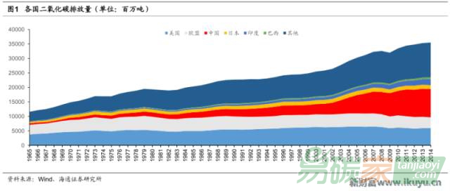 2014年,中國(guó)二氧化碳排放量為為97.6億噸,占全球排放量的27%,已超過(guò)美國(guó)和歐盟總排放量(97億噸)),為全球二氧化碳排放量最大的國(guó)家。我國(guó)二氧化碳排放量仍處于緩慢上升中,而美國(guó)、歐盟已進(jìn)入下降通道,預(yù)計(jì)未 ... ...