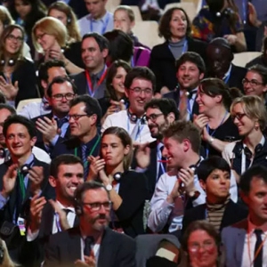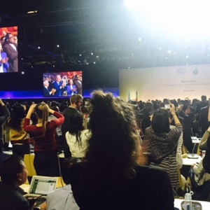 巴黎協(xié)定達成,現場人們起立鼓掌。孫瑩攝巴黎時間周六晚上7:29分,在巴黎東北郊外的勒布爾熱會場,數千人在焦慮地等待。69歲的法國外長法比尤斯,兩鬢已經斑白。他坐在主席臺正中央,顯然已嚴重缺乏睡眠。他的眼鏡不 ...